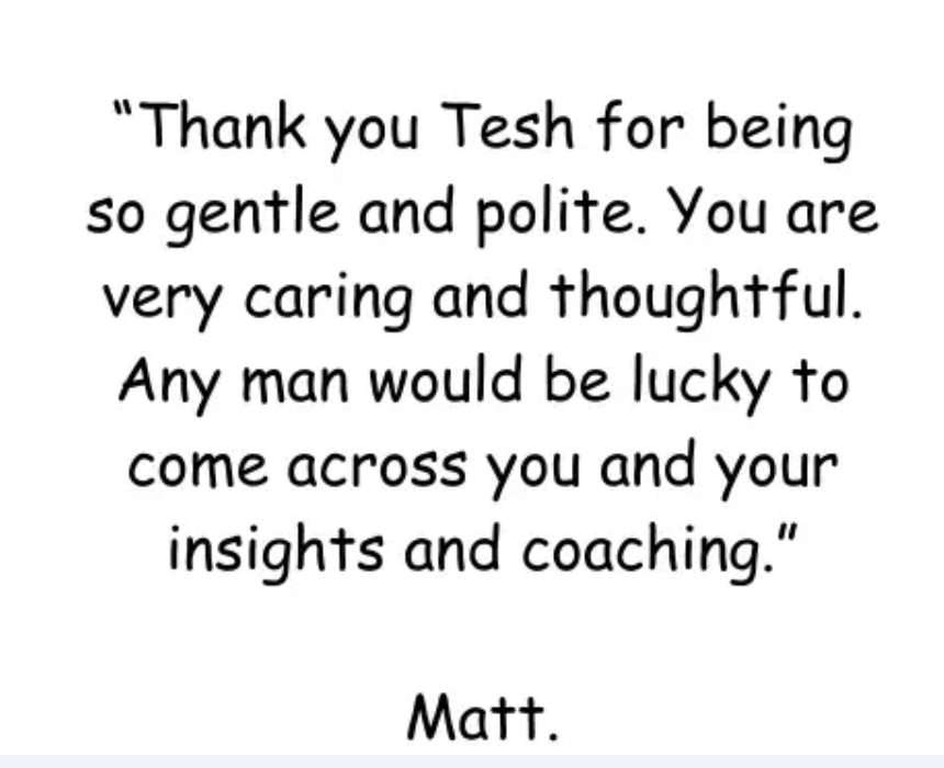 I first started coaching men when I was single. Men on dating sites would ask for feedback, apply my advice, and see instant results. Those raw, honest conversations made me realise how naturally men opened up when they felt safe and unjudged and how much I enjoyed helping them reconnect with their confidence and truth.